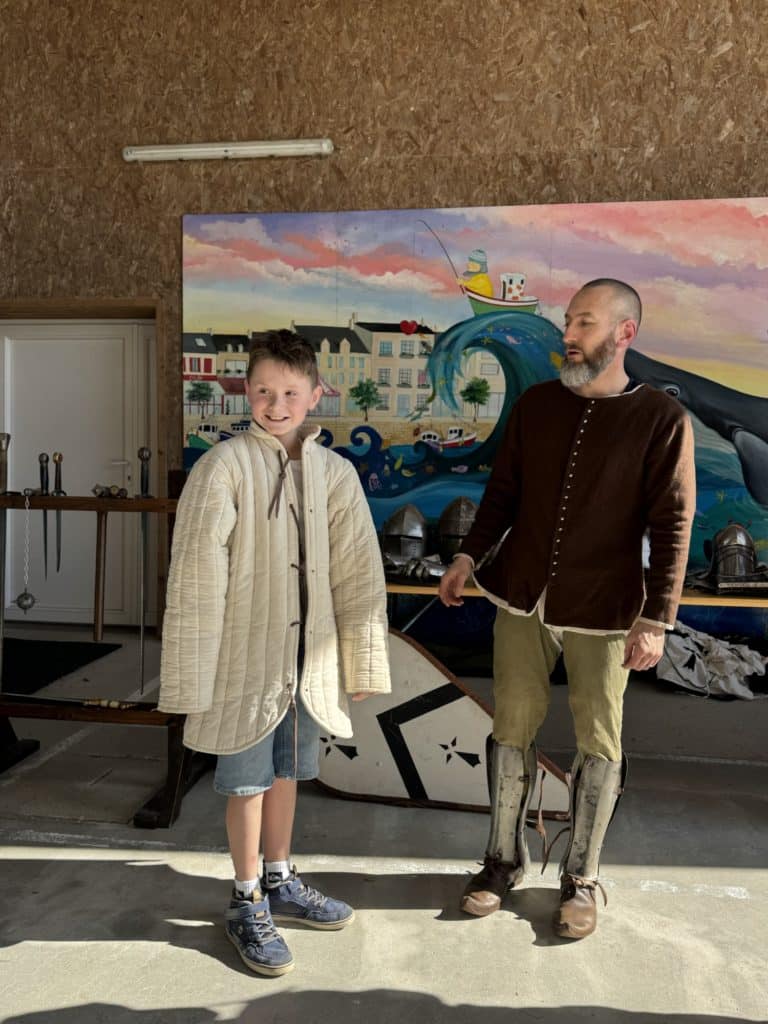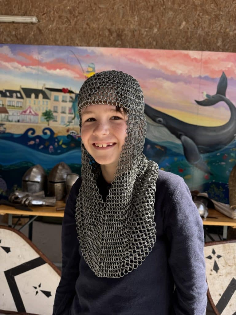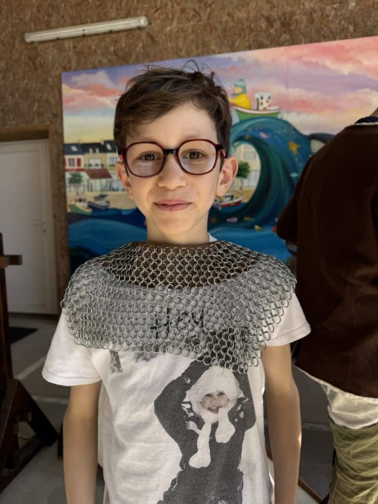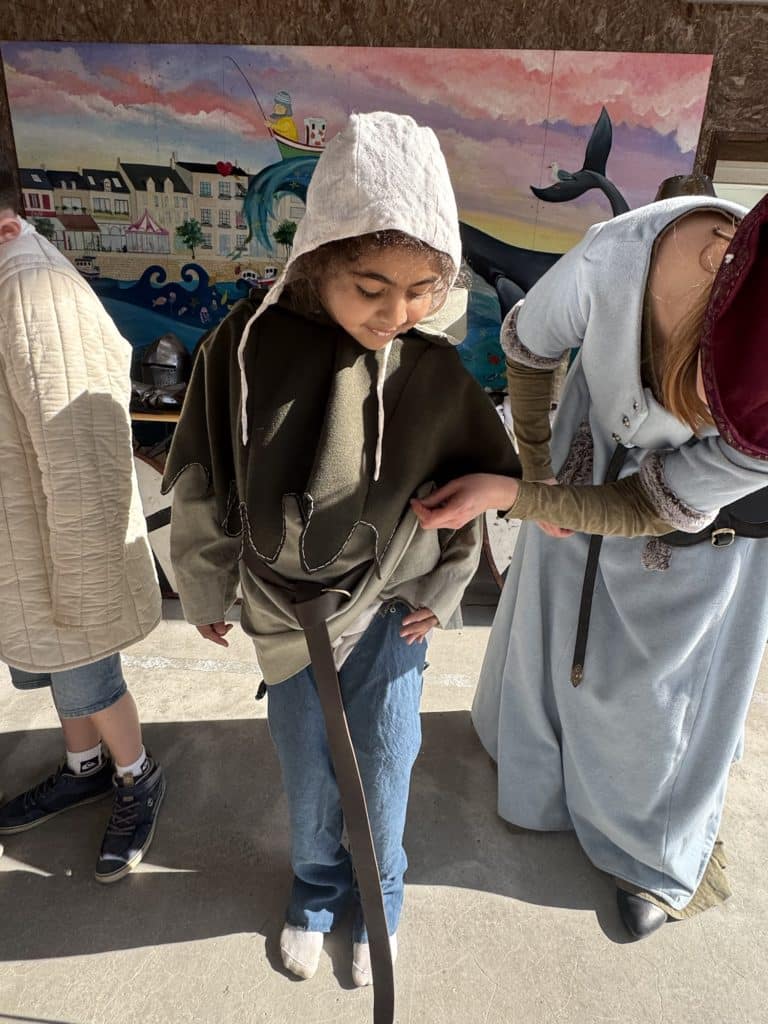 Tout au long de l’après-midi, les intervenants ont partagé leur passion et leurs connaissances avec enthousiasme. Les enfants ont découvert les différentes tenues portées à l’époque médiévale, ainsi que les armes et armures utilisées par les chevaliers. Grâce à des explications claires et captivantes, ils ont mieux compris le rôle de chaque élément d’équipement et son importance dans les combats.