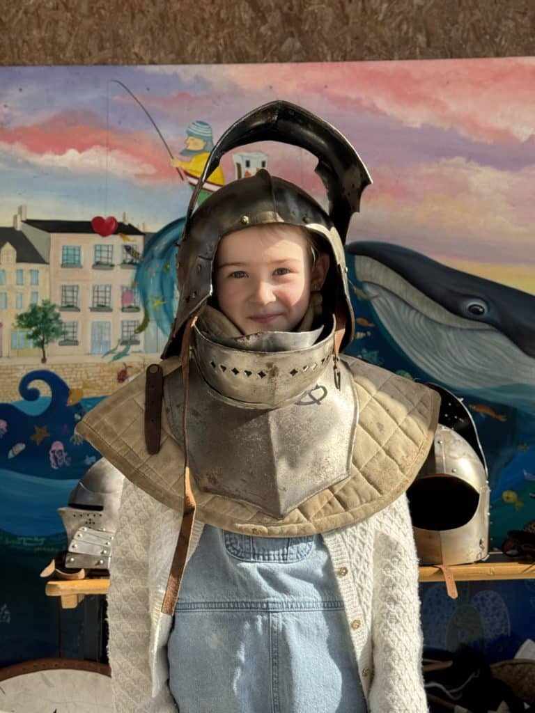 Moment particulièrement attendu : plusieurs élèves ont eu la possibilité d’essayer certaines pièces d’armure, se glissant ainsi dans la peau de véritables chevaliers le temps d’un instant.